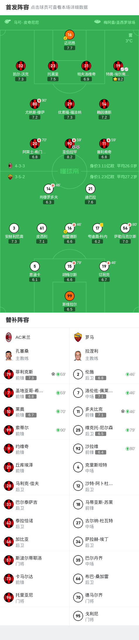 下半场开始后,AC米兰仍然保持着强势的节奏。特奥角球传中连线凯尔-沃克头球击中横梁,但罗马的多夫比克后点包抄垫射破门,将比分拉近至1-2。阿莱士-希门尼斯因越位在先进球被吹,让AC米兰的进球落空。然而,米兰的新援替补首秀却取得了成功,圣地亚哥-希门尼斯助攻菲利克斯挑射破门,打入了米兰生涯的首球,将比分扩大至3-1。